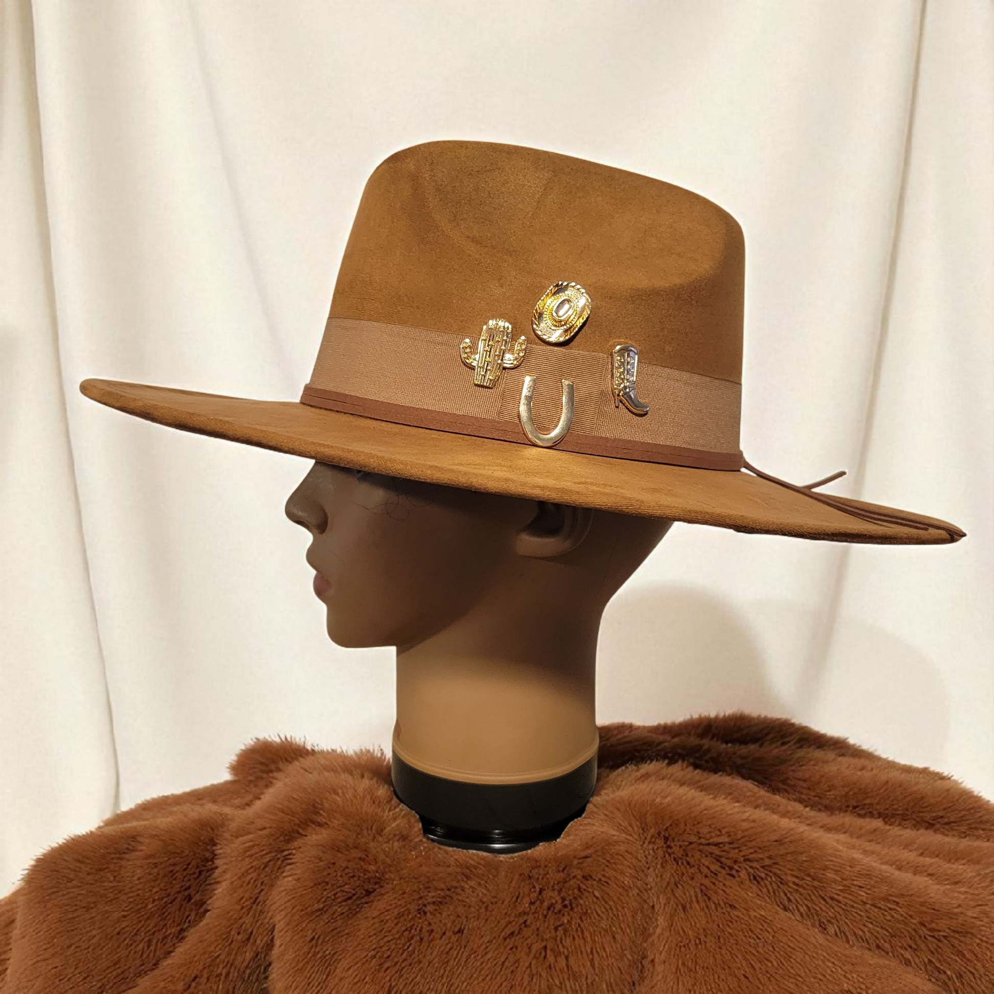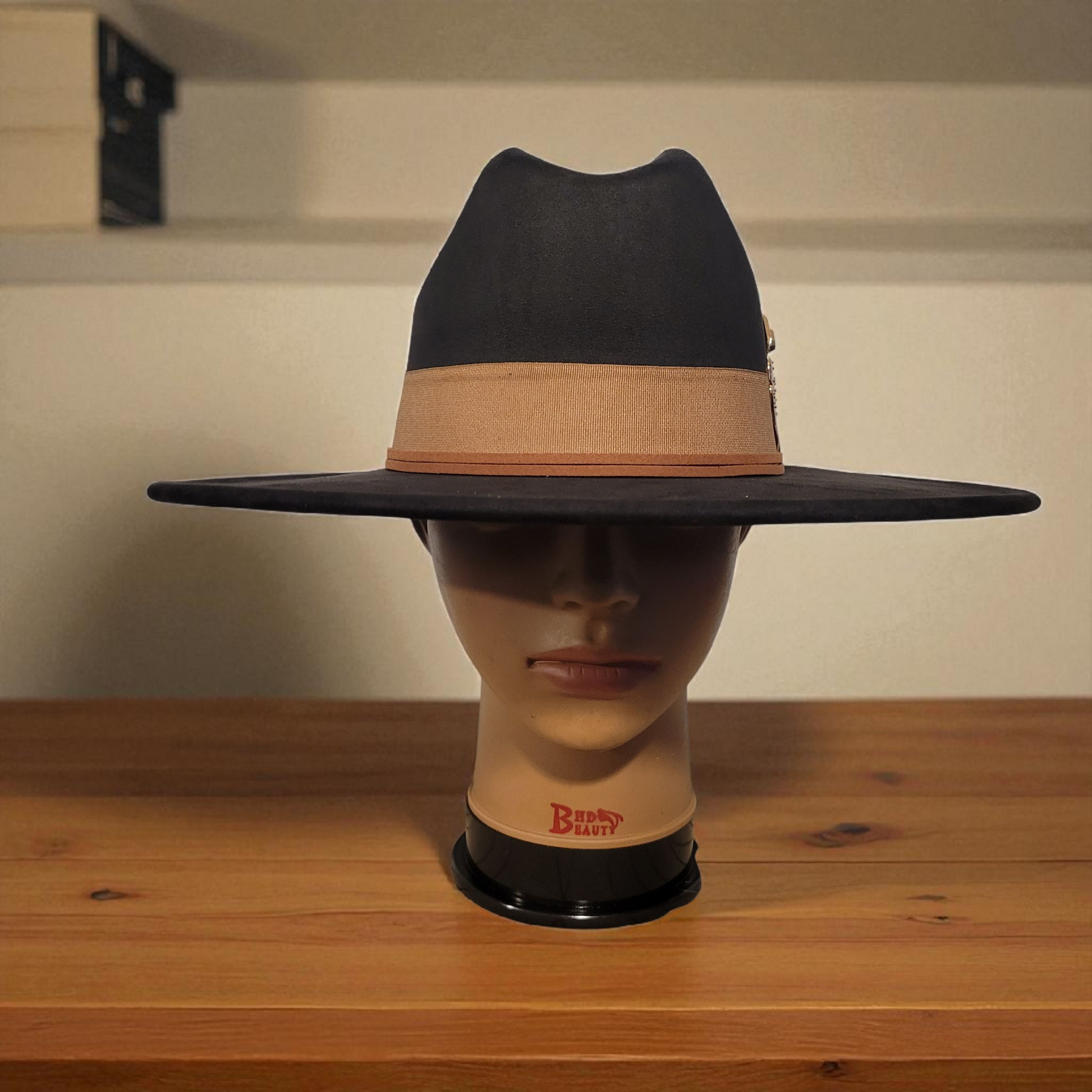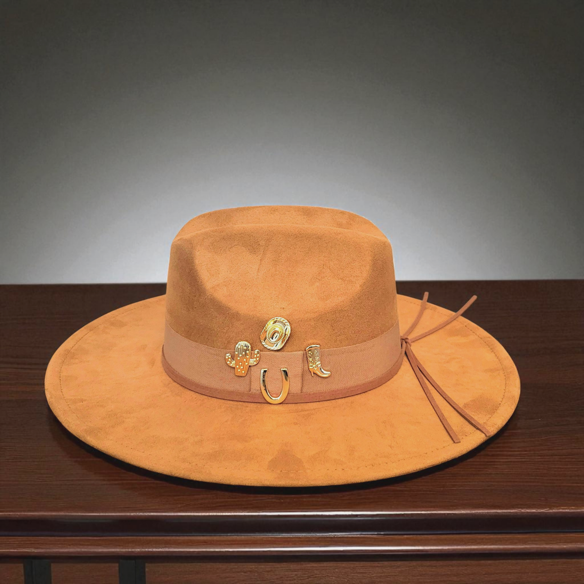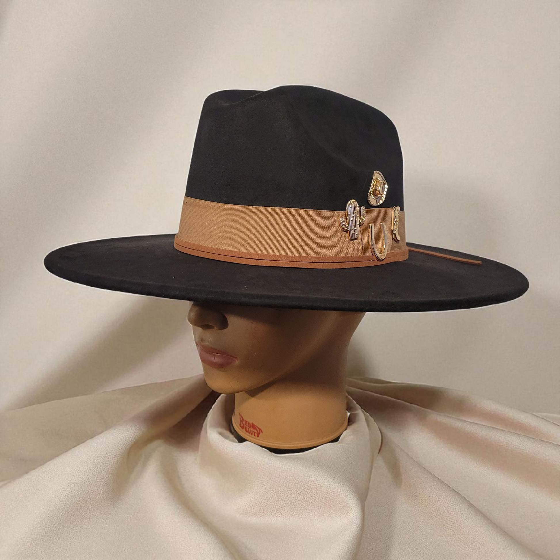 Sleek Wide brim fedora with western charms accent on a sleek grosgrain band