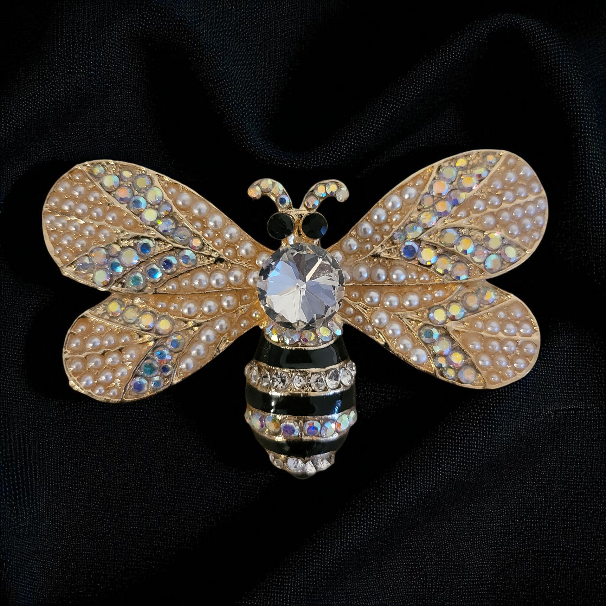 Iridescent rhinestone & pearl wide winged bee.