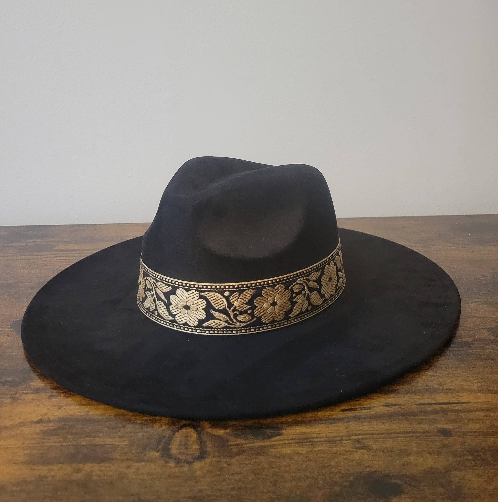 Nubuck wide brim fedora with gold and black floral detail band.