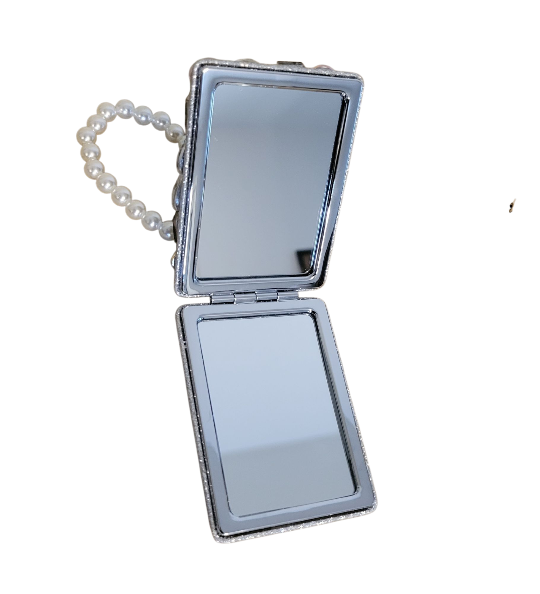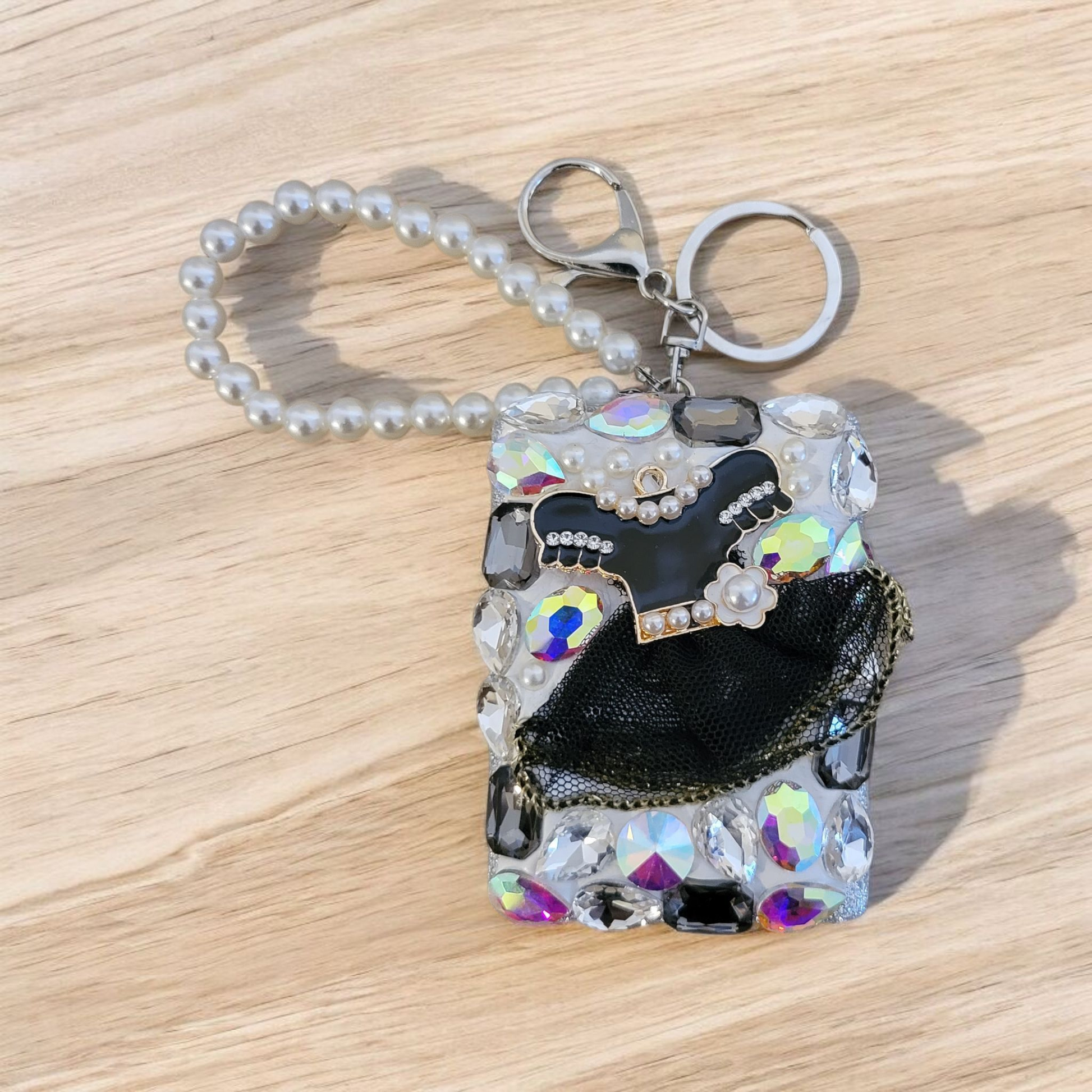 Designer inspired charm and rhinestone clusteted mirror keychain with pearl wristlet