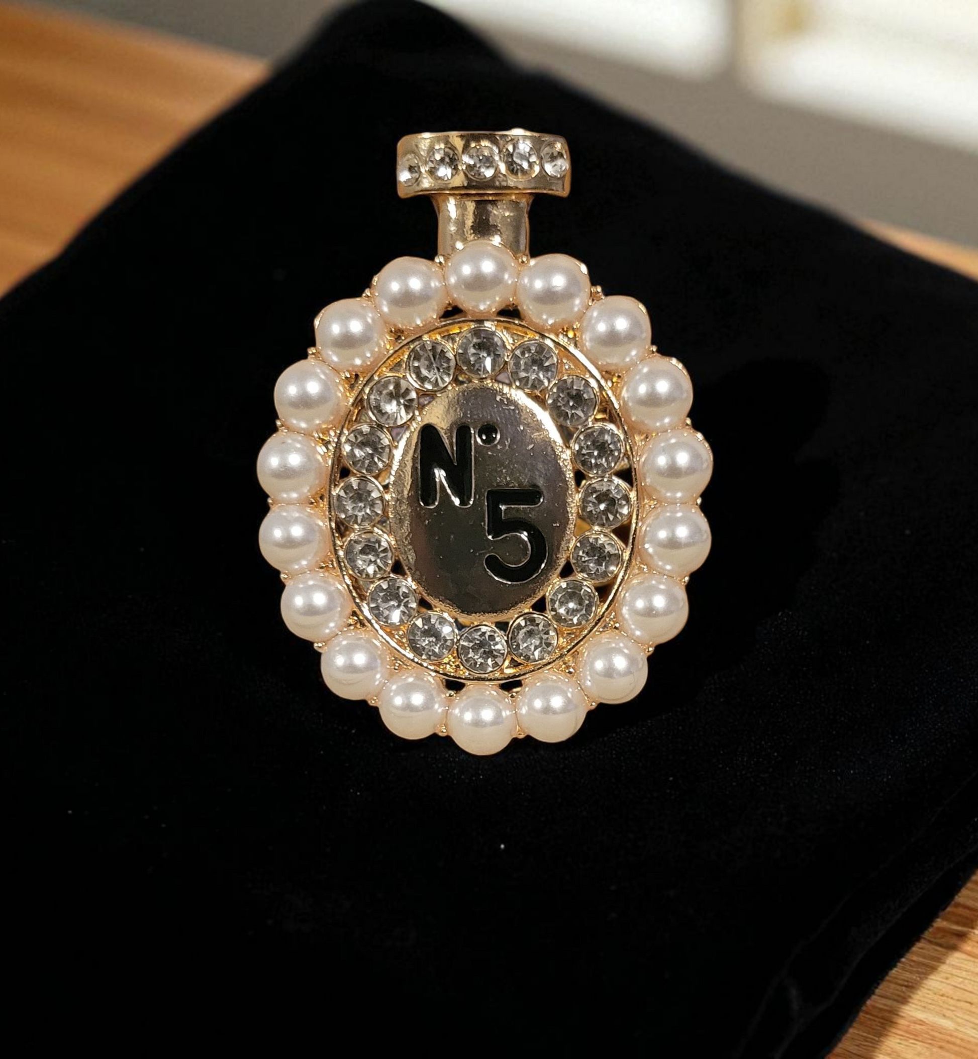 Pearl trimmed perfume brooch with rhinestones